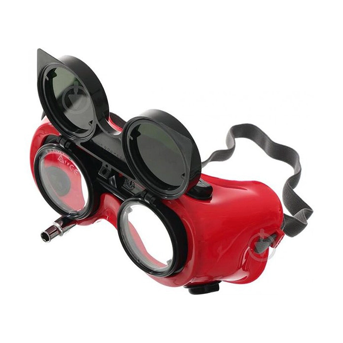 Kaynak gözlüğü. Kaldırılabilir siperlik. Esnek PVC çerçeve. Dolaylı havalandırma. Elastik kayış. Şeffaf polikarbonat iç cam. Şeffaf polikarbonat güçlendirmeli cam ile 5. ton mineral gözlük üst camı.